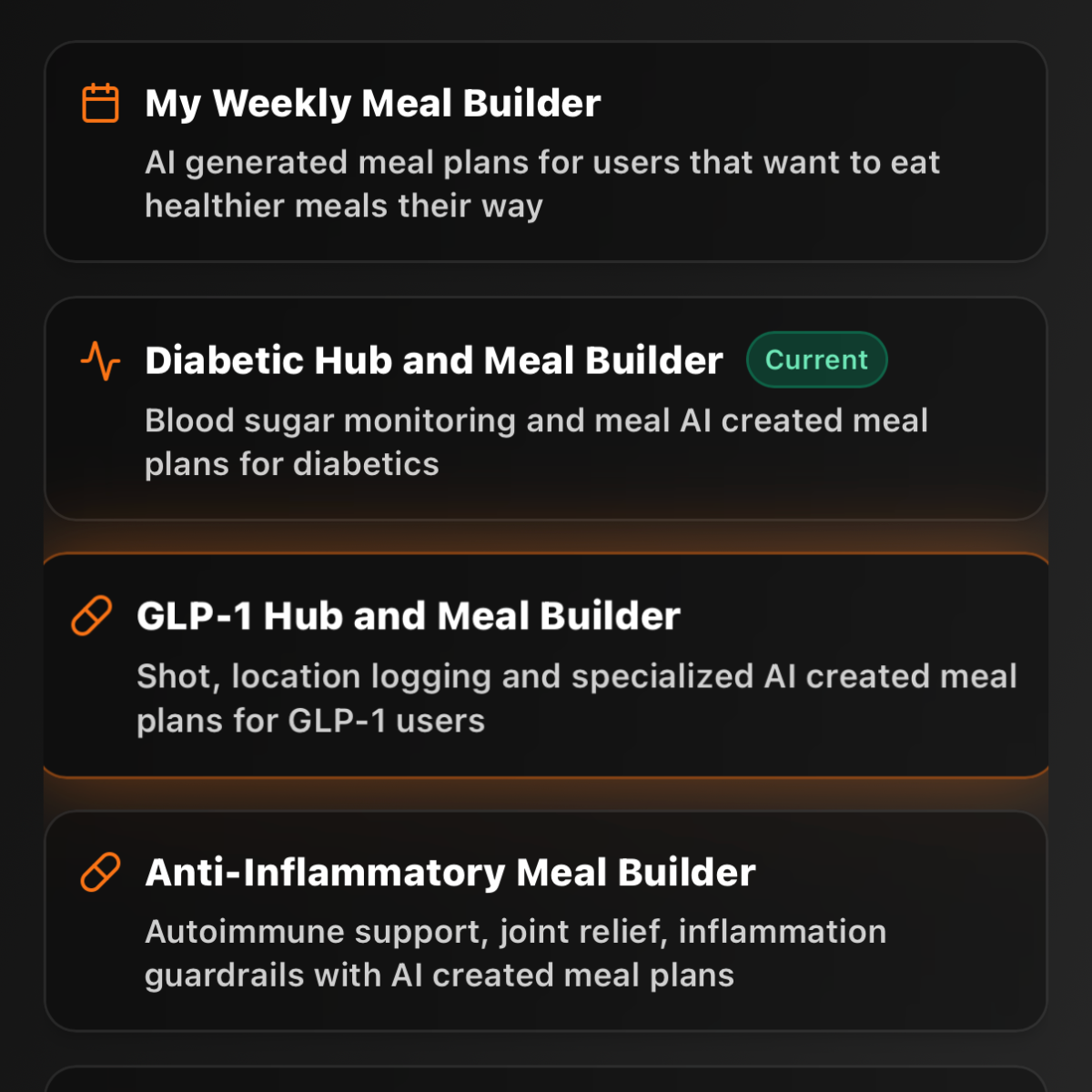 Use builders designed for more specific nutrition needs, with Chef helping adapt meals for diabetic support, GLP-1, and anti-inflammatory meal planning.
